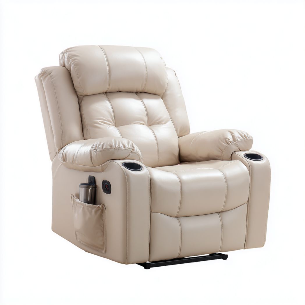 Fauteuil inclinable en similicuir beige avec porte-gobelets et poche latérale