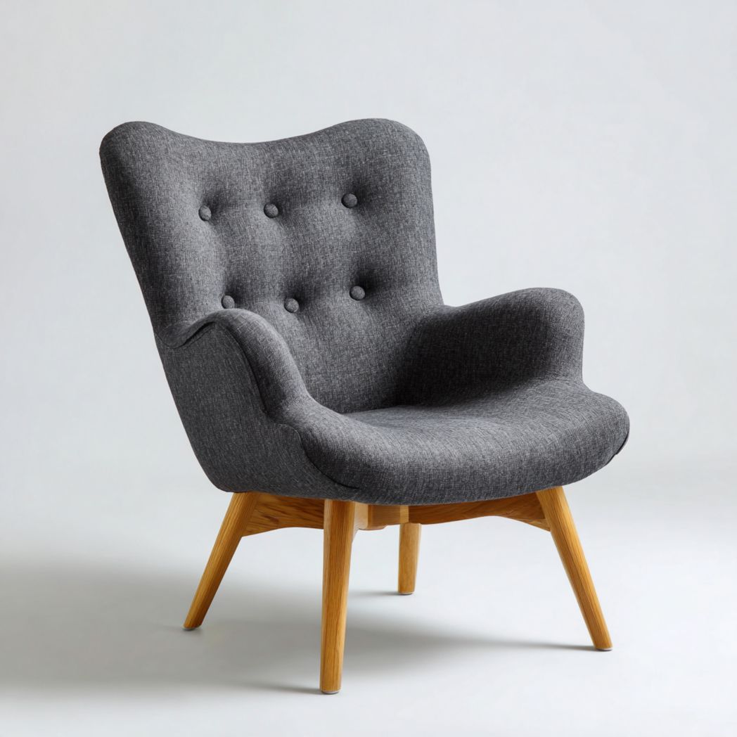 Fauteuil en tissu gris foncé avec pieds en bois et dossier capitonné